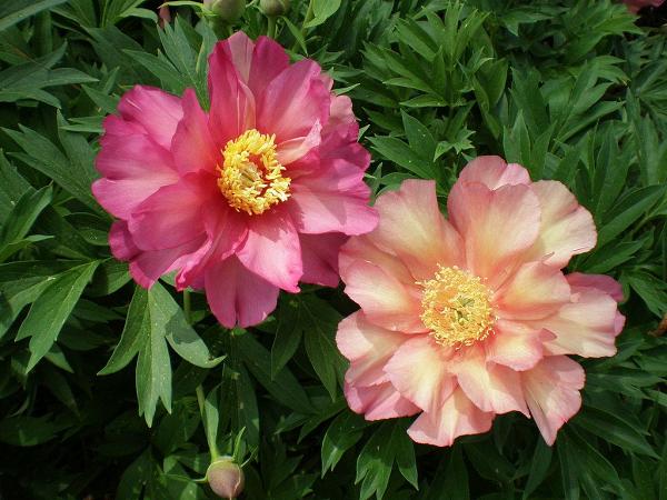 Пион Julia Rose (Джулия Роуз). Окраска изменяется по мере распускания цветка, от вишнёво-красного к апельсиново-розовому и позже к жёлтому. Может в одно и то же время показывать 3 разных оттенка. Куст превосходно сложенный, высотой 80-90 см.