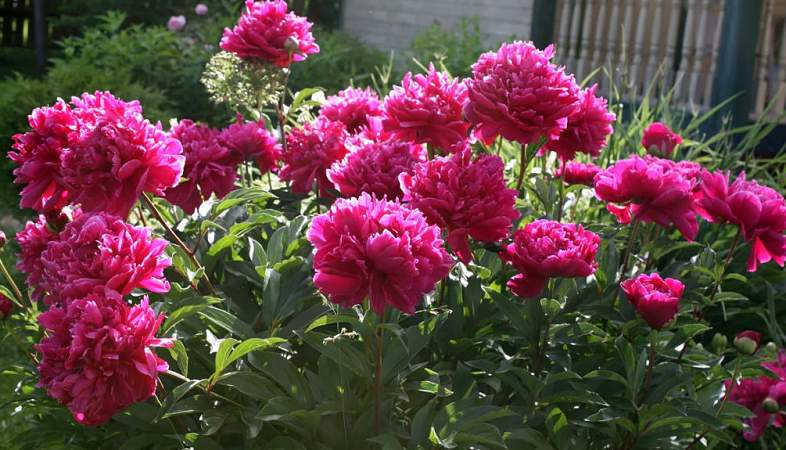 - Несколько пионов рядом — это уже большая однородная масса резной листвы. Если высаживать рядом другие растения, то лучше с цельными листьями. Это лилейники, ирисы, хосты, бадан.