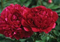 Пион Karl Rosenfield (Карл Розенфилд). Махровый розовидный цветок, темно-рубиновый с неровными краями лепестков. Цветы очень крупные — 20 см.
