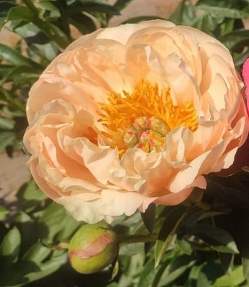 Пион King's Day (Кингс Дэй). Межвидовой гибрид. Окраска уникальная, лососево-оранжевая. Полумахровый, диаметром до 18 см. Высота до 90 см. Побеги прочные, не полегают. Аромат слабый. Цветет обильно в ранние или средне-ранние сроки.