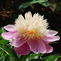Пион Lady Liberty (Леди Либерти). Махровый анемоновидный. Цветок размером 15х8 см, двухцветный. Внешние лепестки овальные, светло-фиолетовые, внутренние лепестки узкие, овальные или полосками, кремовые или розоватые. Аромат лёгкий. Цветение обильное, в средне-поздние сроки. Куст высотой 75-85 см. Стебли прямые, крепкие. Листва обильная, устойчивая к вредителям и болезням. Прекрасный сорт для украшения садов.