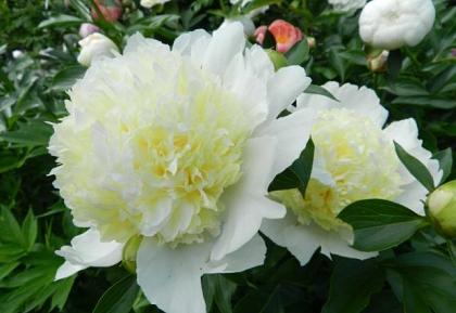 - У высоких пионов часто оголены внизу стебли. В этом случае требуется посадить растения, закрывающие "ноги" пиона. Чаще всего на эту роль подходят округлые подушковидные растения: герань. гейхера, манжетка, буквица, бадан, хоста, низкие ирисы, подушковидные астры, примулы, маленькие летники.