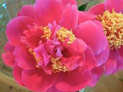 Пион Le Charme (Ле Чарм). Цветок яркий лососево–розовый с желтыми стаминодиями и розовыми петалодиями в центре; лепестки плотной текстуры. Куст высокий, на стебле 3-4 бутона, что позволяет этому сорту цвести продолжительно. Устойчив к дождю. Высота 80 см.