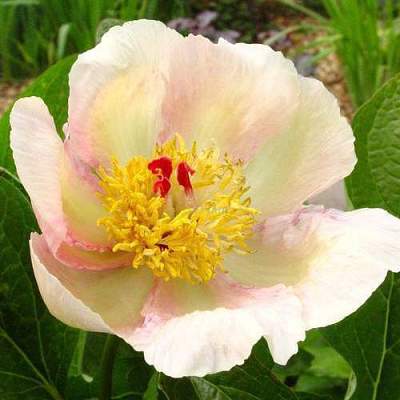 Цветок бело-розово-жёлтый, ярко жёлтые тычики. Высота куста до 60-80 см. Наилучшее цветение пионы дают в возрасте 4-10 лет.