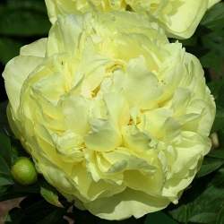 Пион Lemon Chiffon (Лемон Шиффон). Гибрид. Один из лучших жёлтых травянистых пионов. Цветок большой, эффектный, отличной формы, от полумахрового до махрового бомбовидного, лимонно-жёлтый с жёлтыми тычинками. Пестики с фиолетовыми рыльцами. Лепестки плотные.