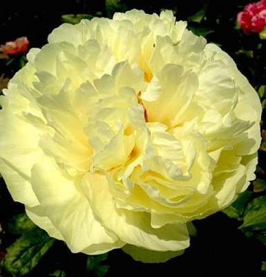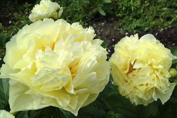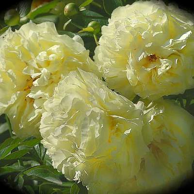 Пион Lemon Chiffon (Лемон Шиффон). Гибрид. Один из лучших жёлтых травянистых пионов. Цветок большой, эффектный, отличной формы, от полумахрового до махрового бомбовидного, лимонно-жёлтый с жёлтыми тычинками. Пестики с фиолетовыми рыльцами. Лепестки плотные.
