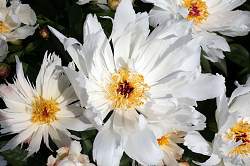 Пион Lois Kelsey (Луис Келси). Необычный сорт. Цветок диаметром 15 см, кремово-белый, простой и полумахровый, плоский, с длинными узкими, глубоко, до самого основания, изрезанными лепестками, отходящими от центра как лучи солнца. Поразительный контраст белых лепестков, красных пестиков и жёлтых коротких тычинок. Высота 80 см. Срок цветения средний.