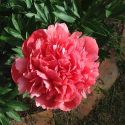Пион Lorelei (Лорелея). Гибрид. Махровый бомбовидный. Цветок диаметром 14 см, изумительного тёмно-оранжево-розового тона, редкого для пионов, при отцветании переходящего в лёгкий абрикосово-оранжевый. Аромат сладкий.