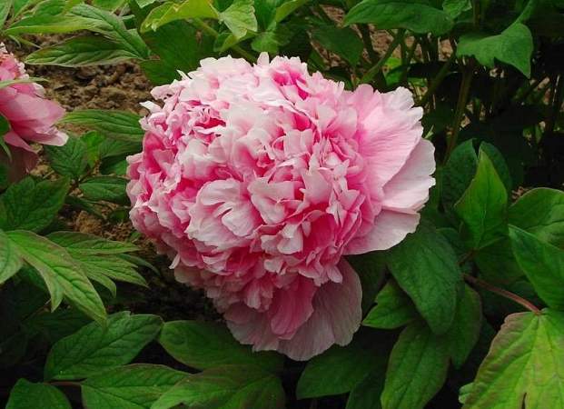 Пион древовидный Lu Fen (Розовый Лу). Цветки крупные (более 17 см), корончатой формы, красивого нежно-розового цвета. Растет быстро. Сорт ценится за раннее и очень обильное цветение.