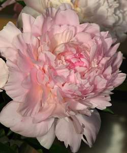 Пион Madam Calot, Mme Calot (Мадам Кало). Цветок полушаровидный, бело-розовый с махровой жёлтой серединой. Цветение обильное. Красивая листва. Прекрасен в срезке. Сорт средне-раннего срока цветения.