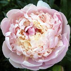 Цветок полушаровидный, бело-розовый с махровой жёлтой серединой. Цветение обильное. Красивая листва. Прекрасен в срезке. Сорт средне-раннего срока цветения.