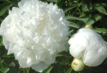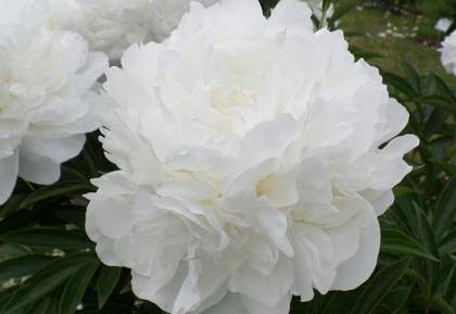 Пион Madame Claude Tain (Мадам Клод Тен). Цветок махровый, диаметром 14 см, очень красивой формы, чисто-белый, слегка кремовый в центре. Внешние лепестки большие. Центральные лепестки меньшего размера, образуют купол. Аромат хороший. Стебли прочные. Высота 80 см. Цветение обильное, в средне-поздние сроки. Отлично подходит для сада и срезки.