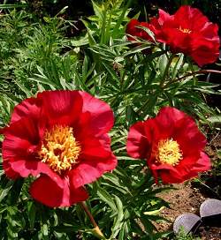 Пион Merry Mayshine (Мерри Мейшайн). Межвидовой гибрид. Цветок 13 см, темно-красный с золотыми тычинками. Лепестки широкие. Листья тонкие, сильно рассеченные. Стебли сильные, не полегают. Высота 60 см. Супер ранний. Имеет награды.