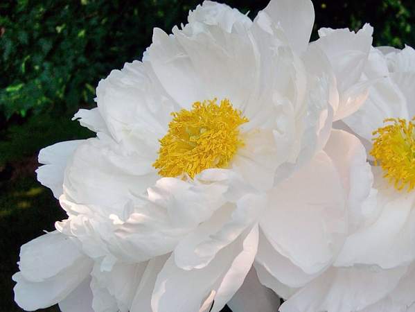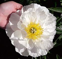Пион Miss America (Мисс Америка). Полумахровый. Цветок лёгкий, воздушный, белый, при роспуске розовеющий, диаметром 25 см. В центре золотистые тычинки. Высота 80 см. Срок цветения ранний. Прекрасный пион для сада или срезки в вазы. Сорт получил дважды Золотую медаль от американского общества пионов, в 1956 и в 1971 гг.