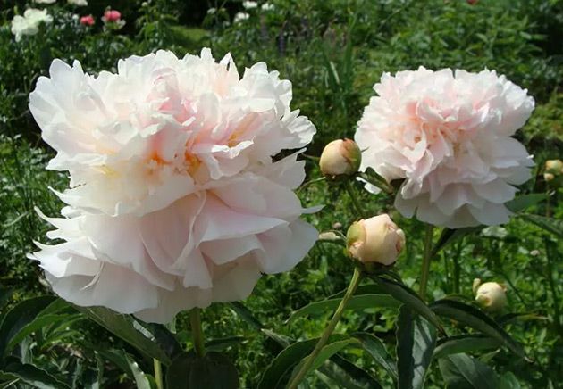 - У высоких пионов часто оголены внизу стебли. В этом случае требуется посадить растения, закрывающие "ноги" пиона. Чаще всего на эту роль подходят округлые подушковидные растения: герань. гейхера, манжетка, буквица, бадан, хоста, низкие ирисы, подушковидные астры, примулы, маленькие летники.
