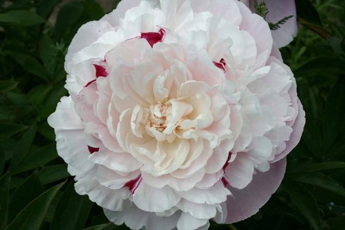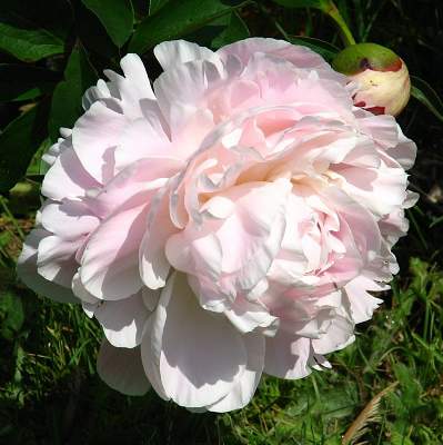 Пион Nick Shaylor (Ник Шейлор). Махровый розовидный. Цветок диаметром 20 см, телесно-розовый с возможными красными мазками, выгорает до белого. Плотный, изящной формы. Аромат очень тонкий.