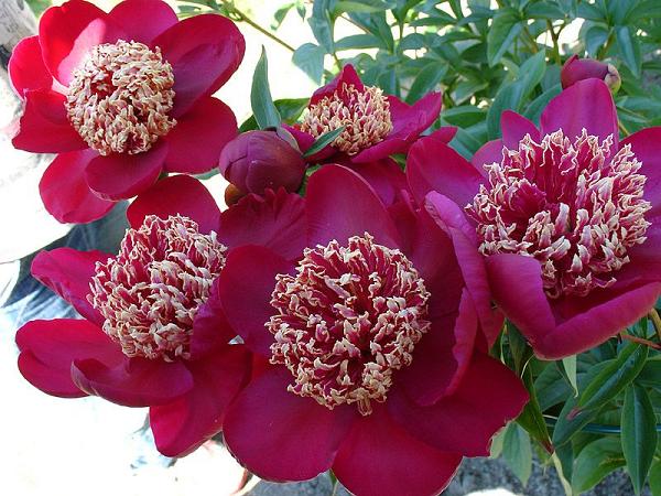 Пион Nippon Beauty (Ниппон Бьюти). Благородный цвет, необычайная красота раскрывшегося цветка! Лепестки, образующие чашку крупные, темно-вишневые, стаминодии образуют вначале золотистый шар, который раскрывается и становится видно, что каждый язычок малиновый с четкой золотистой обводкой. Куст до 90 см. Побеги крепкие, никогда не полегают. Цветение длительное. Очень хорошо держит дождь. Прекрасен как в саду, так и в букете.
