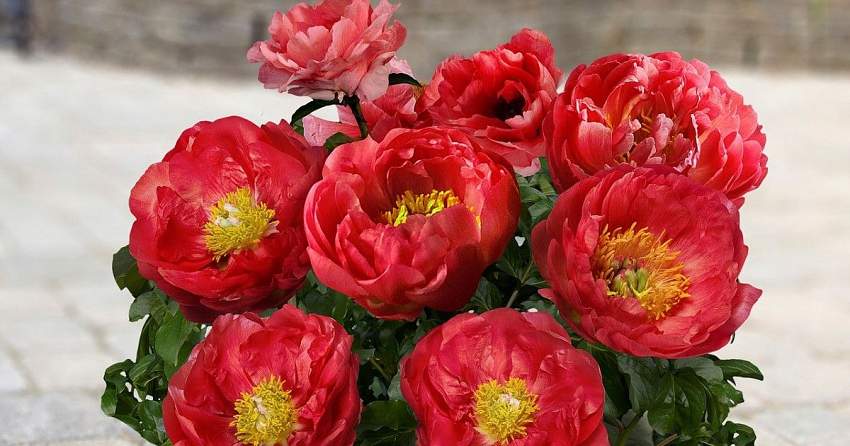 Пион патио Moscow (Москва). Межвидовый гибрид. Махровый анемоновидный — бомбовидный. Ярко-красный чистого тона, к центру темнее. Компактный. Стебли толстые, прочные. Аромат приятный. Средний срок цветения.
