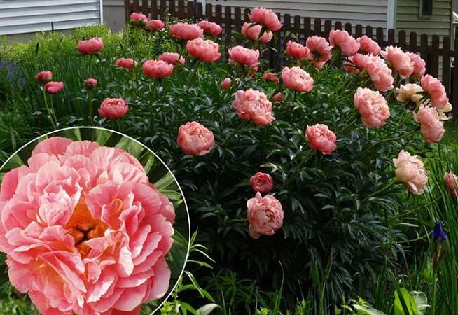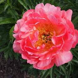 Пион Pink Hawain Coral (Пинк Ховайн Корал). Цветок полумахровый, кораллово-розовый. В полном роспуске цветок может иметь разные абрикосовые оттенки. Аромат свежего сена. Стебли прочные. Куст декоративный. Отличный ландшафтный сорт.