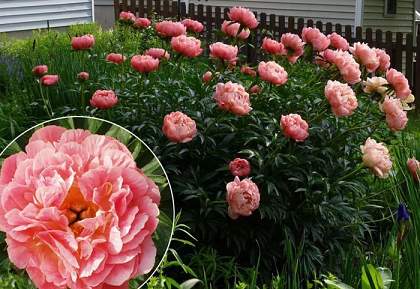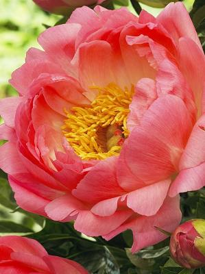 Пион Pink Hawain Coral (Пинк Ховайн Корал). Цветок полумахровый, кораллово-розовый. В полном роспуске цветок может иметь разные абрикосовые оттенки. Стебли прочные. Куст декоративный. Отличный ландшафтный сорт.