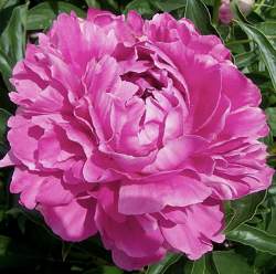 Пион Princess Margaret (Принцесс Маргарэт). Махровый розовидный. Цветок шикарный, диаметром 20 см, плоский, тёмно-розовый, лепестки крупные, свободные, есть пестики, ароматный, высота 80 см, стебли мощные, ребристые, листья крупные, слегка сборчатые, зелёные, средне-раннего срока цветения.