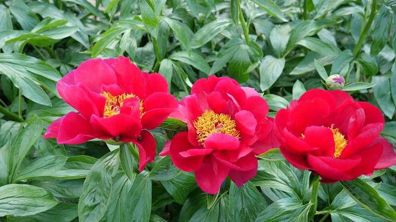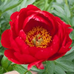 Пион Red Red Rose (Ред Ред Роуз). Гибридный, полумахровый. Лепестки расположены в три ряда. Цветок крупный, 16 см в диаметре, сверкающе-красный. Ароматный. Стебли прочные. Листья средне-зелёные, блестящие. Высота 90 см. Среднего срока цветения.