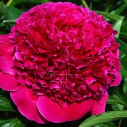 Пион Renato (Ренато). Цветок с очень яркой окраской. Лепестки глянцевые. Тип бомбовидный - на "тарелочке" густомахровый шар. Куст до 80 см. Цветет в средние сроки.