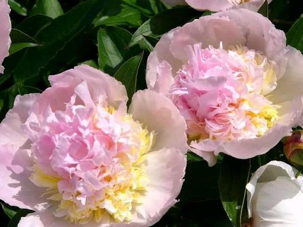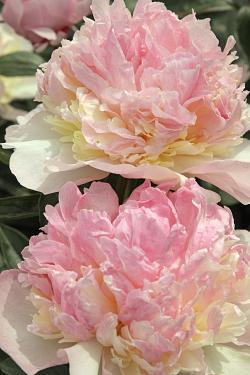 Пион Robijn (Робиджен). Нижние лепестки розовые, а к центру — желтые, махровые, диаметром 16 см. Зацветает в ма-июне, цветение обильное. Имеет легкий аромат. Листья тёмно-зелёные, с красным оттенком. Высота растения 90-100 см. Срок цветения ранний.