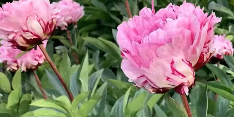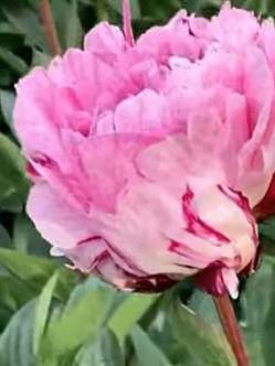 Пион Sarah Bernhardt Unique (Сара Бернар Юник). Красиво сложенный цветок диаметром до 20 см. Высота 80 см. Цветет в поздние сроки. Цветок розовидный, внешние лепестки крупные. Особенность сорта в том, что лепестки испещрены темными штрихами. Стебель и чашелистик темно-бордовые, что создает красивый контраст с розовыми цветками.