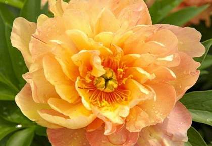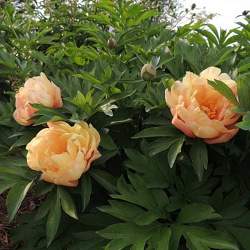 Пион Singing in the Rain (Сингинг ин зе Рейн). Ито-гибрид с очень крупными цветками желто-оранжевого цвета. Цветки махровые, 20 см в диаметре. Бутоны розовые. Цветки великолепной формы, открываются лимонно-желтыми, позже приобретают золотистые и персиковые оттенки. Одновременно на кусте могут быть желтые и розовые цветки.