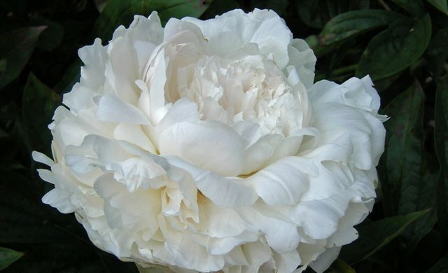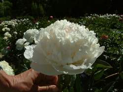 Пион Snow Supreme (Сноу Суприм). Цветок шаровидный, огромный, диаметром 20 см, махровый, ароматный. Цвет слоновой кости с жёлтым оттенком у основания лепестков. Куст высотой до 90 см.