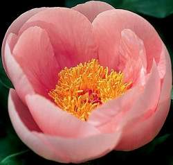 Пион Soft Salmon Saucer (Софт Салмон Сосэ). Нежнейший, прекрасный в своей простоте гибридный пион с изящным цветком среднего размера в форме чашечки. Лепестки мягкого лососёво-розового цвета, более тёмного у основания. Центр из жёлтых тычинок. Ароматный. Куст высотой 80 см. Раннего срока цветения.