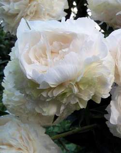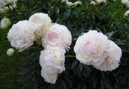 Пион Solange (Соланж). Высота куста 80-90 см. Цветок кремовый с нежно-лососёвым оттенком, открывается медленно. Куст раскидистый. Стебли толстые, изгибаются.