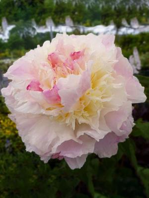 Пион Solange (Соланж). Высота куста 80-90 см. Цветок кремовый с нежно-лососёвым оттенком, открывается медленно. Куст раскидистый. Стебли толстые, изгибаются.