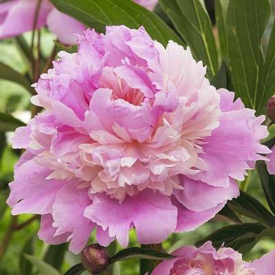 Пион Sorbet (Сорбе). Цветки крупные, 17 см и более. Куст компактный, побеги сильные. Популярный сорт с перламутровой окраской.