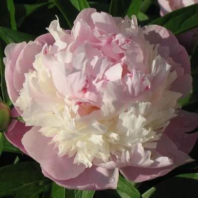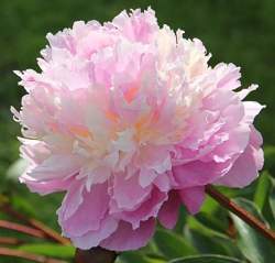 Пион Sorbet (Сорбе). Цветки крупные, 17 см и более. Куст компактный, побеги сильные. Популярный сорт с перламутровой окраской.