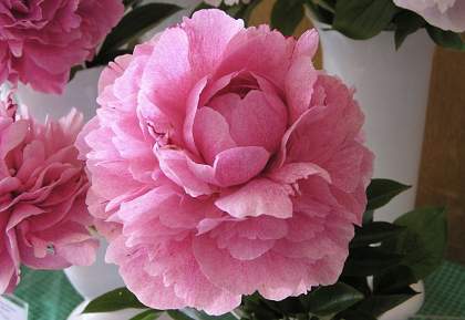 Пион The Fawn (Фавн). Махровый розовидный. Очаровательный необычный сорт с цветками отличного сложения. Диаметр цветка 16 см. Лепестки розовые с сиреневыми штрихами. Куст около 80 см высотой. Побеги сильные. Листья рельефные, блестящие. Срок цветения средне-поздний.