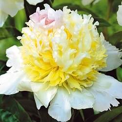 Цветок диаметром 18 см, переливчатый — наружные лепестки розоватые, затем корона из ярко-жёлтых коротких петалодий, центр кремово-розовый, махровый. Высота куста до 100 см. Цветение в средние сроки. Очень необычная форма цветка.
