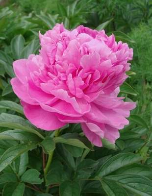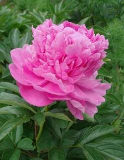 Пион Vivid Rose (Вивид Роуз). Махровый. Цветок высокий и пышный, диаметром 18 см, ярко-розовый с необычным бронзовым блеском у основания лепестков. Ароматный. Куст мощный, раскидистый, высота 80 см.