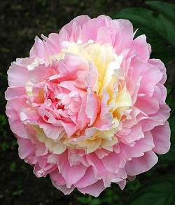 Пион Whopper (Вупер). Махровый бомбовидный. Цветок 16 см диаметром, трехцветный. На широких внешних лепестках нежно-розового цвета расположен шар, состоящий из кремовых петалодий, в центре которого светло-розовые лепестки. Лепестки атласные.