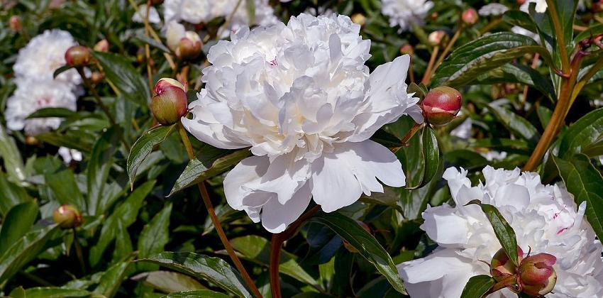 Пион Xian He Bai (Белый Журавль). Крупные белые бутоны, шелковисто-гладкие лепестки и эффектный контраст с зеленью листьев. Достоен расти на лучшем месте в вашем саду!