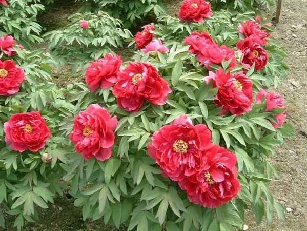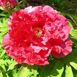 Пион Xu Gang (Восход). Цветки полумахровые, диаметром 20 см, шелковистые ярко-красные, с приятным ароматом. Тычинки яркие желтые. Кусты мощные, прямые.