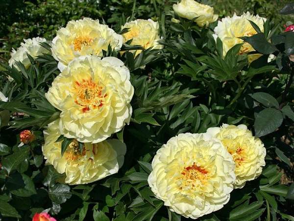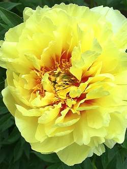 Пион Yellow Crown (Йеллоу Краун). Цветок махровый, диаметром 15 см, ярко-жёлтый с красными вспышками в основании лепестков. Цветение обильное.
