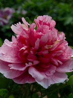 Пион Ying Ri Hong (Красный Шар). Цветок махровый, 17 см, красно-малиновый. Внешние лепестки светлее. Окраска сильно зависит от солнечного освещения, чем больше солнца, тем ярче цвета. В основании лепестков пурпурные пятна. Цветки смотрят вверх.