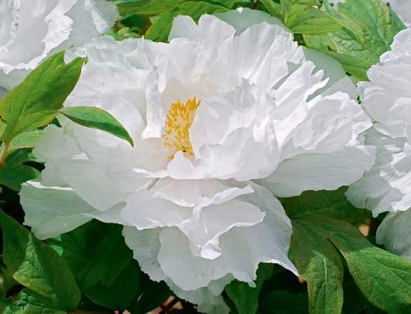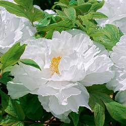 Пион древовидный Yu Ban Bai (Белый Нефрит). Цветки лотосовидные, белоснежные, крупные (17 см). Побеги прочные, листья темно-зеленые. Классический китайский древовидный пион. Один из самых красивых среди белых сортов.