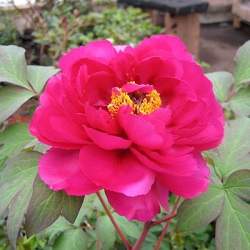 Растение декоративно и после цветения из-за необычной формы листьев. Пион неприхотлив, устойчив к болезням. На одном месте без пересадки может расти более 20 лет. Цветки пурпурно-красного цвета, с золотистыми тычинками в центре, лотосовидной формы, 18 см в диаметре. Куст высотой 90-120 см.