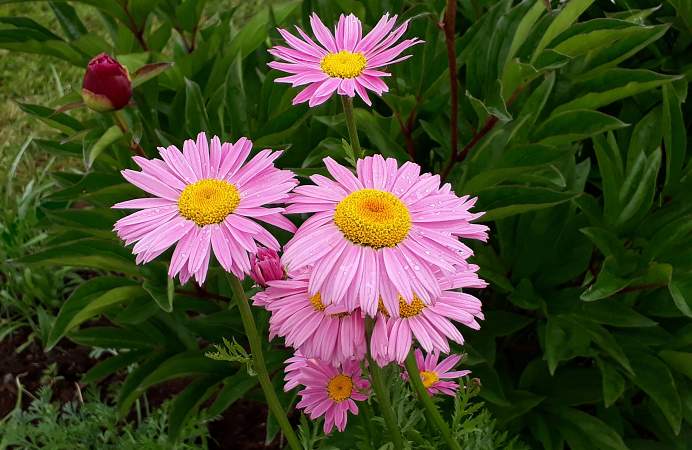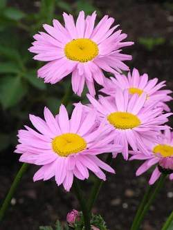 Пиретрум Robinsons Rose (Робинзонс Роуз). Цветки многочисленные, розовые, ромашковидные, диаметром 7,5 см, с большим центральным диском, на сильных стеблях, очень хорошо подходят для срезки. Цветение обильное. Листья изящные, мелко-рассечённые, папоротниковидные, свеже-зелёные.