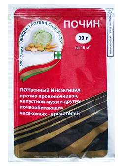 Почин, 30 г. Лучше всего инсектицид Почин борется с проволочником, хрущом, крестоцветной блошкой, совкой, гусеницами и личинками мух. Но самым опасным вредителем картофеля, моркови, свеклы и лука является именно проволочник, т. е. личинка жука щелкуна. Увидеть его в земле невозможно, а результат появится только осенью, при сборе урожая. Все овощи будут насквозь пронизаны червоточинами. В этом случае лучше воспользоваться препаратом Почин от вредителей в профилактических целях, не дожидаясь их появления.