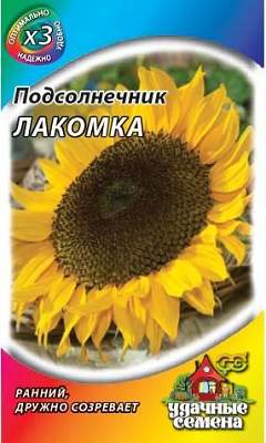 Подсолнечник Лакомка. Скороспелый (от всходов до уборки 65-71 день) высокоурожайный лущильный сорт. Корзинка с семенами большая. Семена крупные, овально-удлиненной формы, черные с серой полосой по краю, хорошо выполненные. Сорт ценится за высокую устойчивость к ложной мучнистой росе и подсолнечной моли. Отличается дружным цветением, созреванием и выравненностью растений по высоте. Хороший медонос. Очищенные семена подсолнечника добавляют в салаты и кондитерские изделия, используют как панировку для котлет. Выращивают прямым посевом семян в открытый грунт на глубину 1,5-2,0 см.