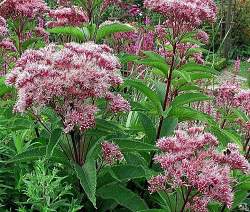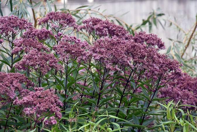 Посконник Phantom (Фантом). Побеги толстые, темно-бордовые, листья крупные, соцветия пышные, седовато-розовые. Очень эффектен! Высота до 120 см. Быстро разрастается, образует пышный видный куст. Цветет с июля до заморозков. Очень любим пчелами и шмелями.